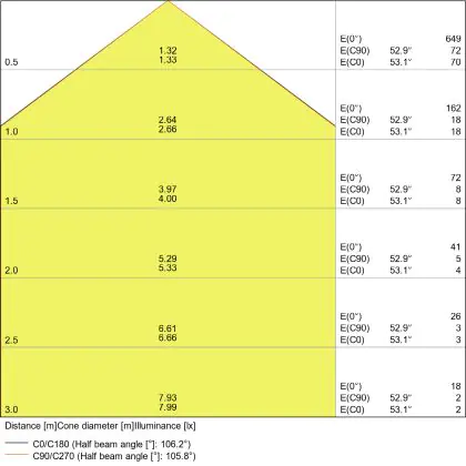 Der Abstrahlwinkel bezeichnet den Winkel, in dem das Licht aus der Lichtquelle ausgestrahlt wird. Er wird in Grad (D) angegeben. Je geringer die Gradzahl des Abstrahlwinkels ist, desto kleiner ist auch der Durchmesser des Lichtkegels, den die Lichtquelle produziert. Beispiel: Wird eine Lampe mit einem Abstrahlwinkel von 60 Grad an der Decke (2,5 m Höhe) angebracht, erzeugt sie einen Lichtkegel von 2,9 Metern Durchmesser. Hat die Lampe hingegen einen Abstrahlwinkel von 120 Grad, beträgt der Lichtkegel 8,7 Meter im Durchmesser. |