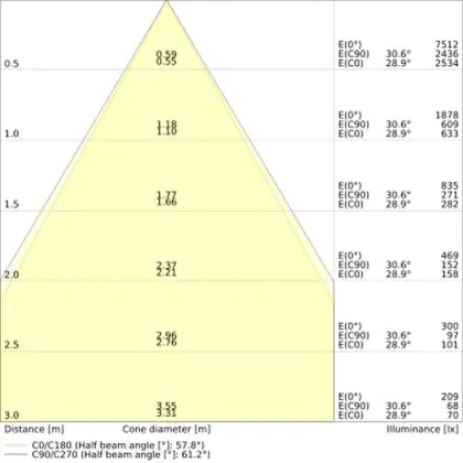 Der Abstrahlwinkel bezeichnet den Winkel, in dem das Licht aus der Lichtquelle ausgestrahlt wird. Er wird in Grad (D) angegeben. Je geringer die Gradzahl des Abstrahlwinkels ist, desto kleiner ist auch der Durchmesser des Lichtkegels, den die Lichtquelle produziert. Beispiel: Wird eine Lampe mit einem Abstrahlwinkel von 60 Grad an der Decke (2,5 m Höhe) angebracht, erzeugt sie einen Lichtkegel von 2,9 Metern Durchmesser. Hat die Lampe hingegen einen Abstrahlwinkel von 120 Grad, beträgt der Lichtkegel 8,7 Meter im Durchmesser. |