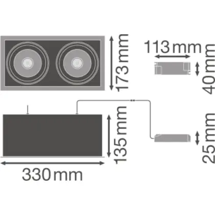 Ledvance Spot LED Carré Multi inclinable Noir-Blanc 2x30W 5400lm 38D - 830 Blanc Chaud | Diamètre 320x160mm est un spot LED encastrable. Ce luminaire est conçu pour un éclairage d’accentuation pour un usage domestique ou bien professionnel. LED Intégré, ce spot LED Ledvance en Aluminium a besoin d’une place nécessaire de 320x160mm de largeur et 250mm de profondeur. Ce luminaire est compatible avec une ampoule GU10, il est important de faire attention si vous décidez de changer d’ampoule.